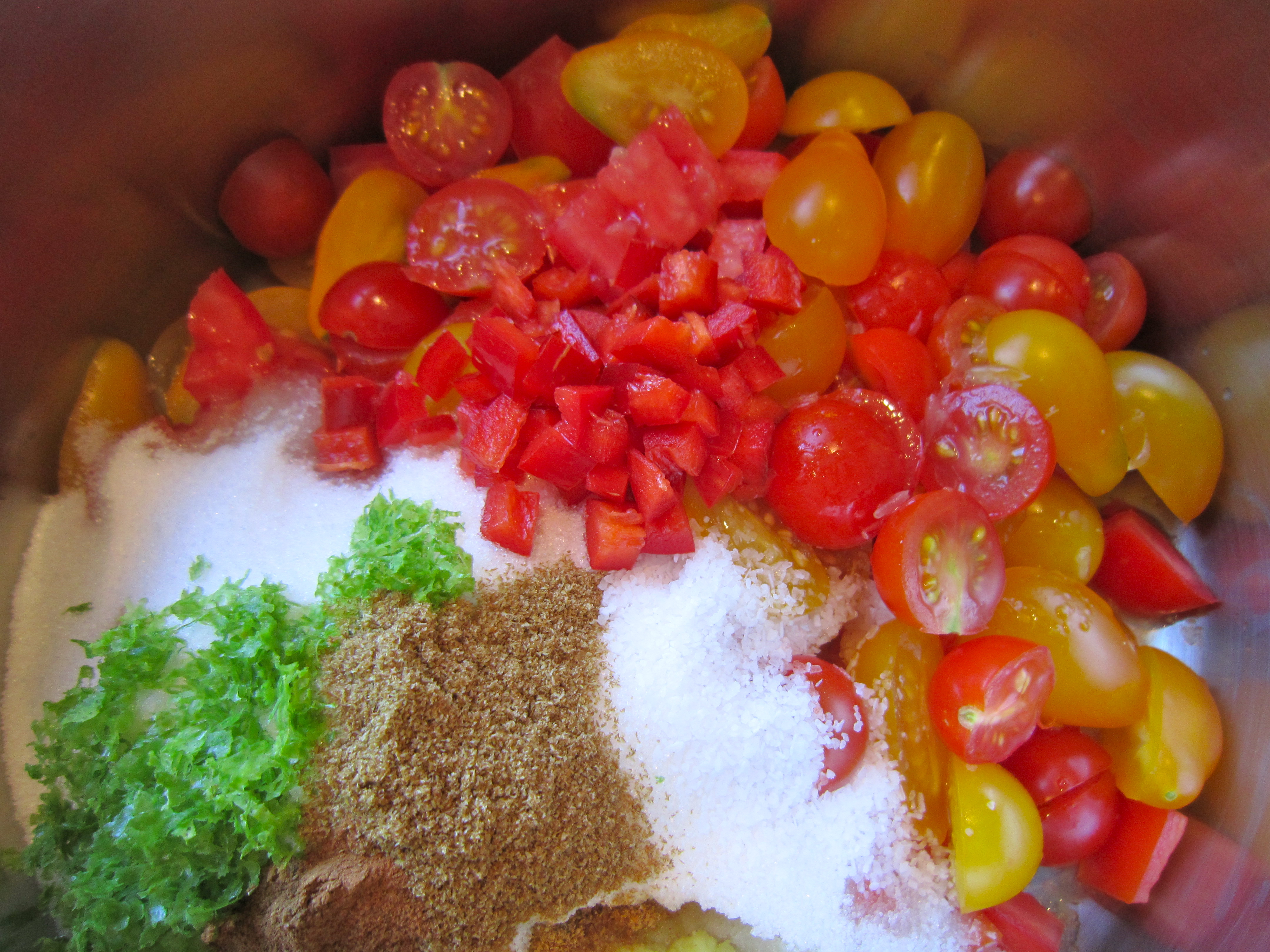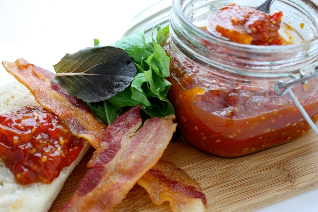 Since I used my mix of red and yellow tomatoes, the color of my jam was not as deep or as rich but the jam itself turned out to be a huge success.  It has a unique and interesting flavor unlike any tomato preparation I’ve ever had.  It is sweet and tangy, with hints of cinnamon and cumin, but the tomato flavor comes through as well.  I’m not a big fan of cloves so I left that ingredient out, but I did add the zest from the lime.  I think I would add a little more of the red pepper flakes next time around to spice it up a bit more.  This would be perfect with some salty cheese like a Spanish Manchego or on a unique spin on the BLT, like we did. Fabulous!