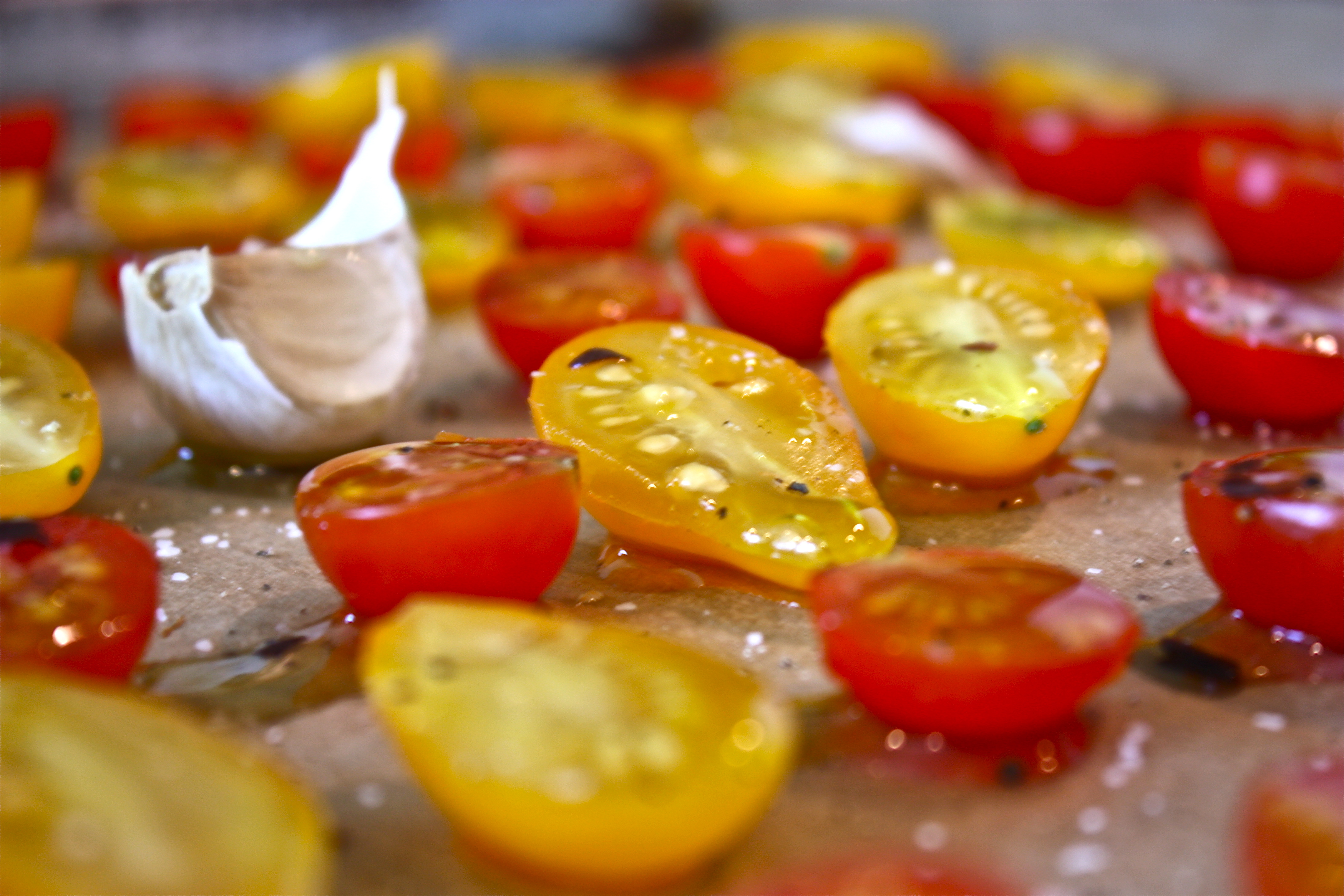 Rinse tomatoes, remove the stem and cut in half. If using larger tomatoes, core and cut into quarters. Place in a single layer in a roasting pan along with the whole cloves of garlic. Drizzle generously with extra virgin olive oil. Season with salt, pepper, and red pepper flakes.
