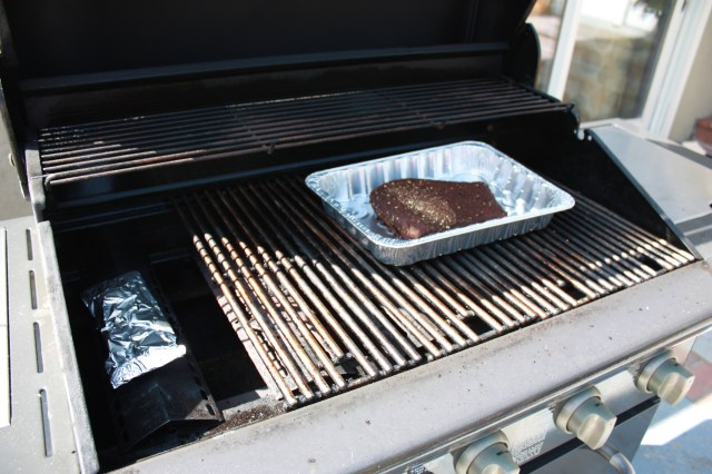 Hello, daisy’s world readers! I’ve wanted to do some kind of low and slow all-day cooking project for sometime now – either smoking, braising or rotisserie-cooking some kind of meat. Then I saw an episode of Alton Brown’s show, Good Eats entitled Right on ‘Cue. In it, he describes in great technical detail how to smoke meat. That was it; I decided that I was going to cook with smoke. I was tempted to invest in a smoker and fancy dual temperature thermometers made specifically for smoking meats, but, in the end I decided to use the gas grill and meat thermometer we already had. The only thing I had to buy was a disposable aluminum pan and a bag of wood chips. I choose cherry wood chips for “medium” smokiness over mesquite or apple wood chips that only promised “light” smoke.