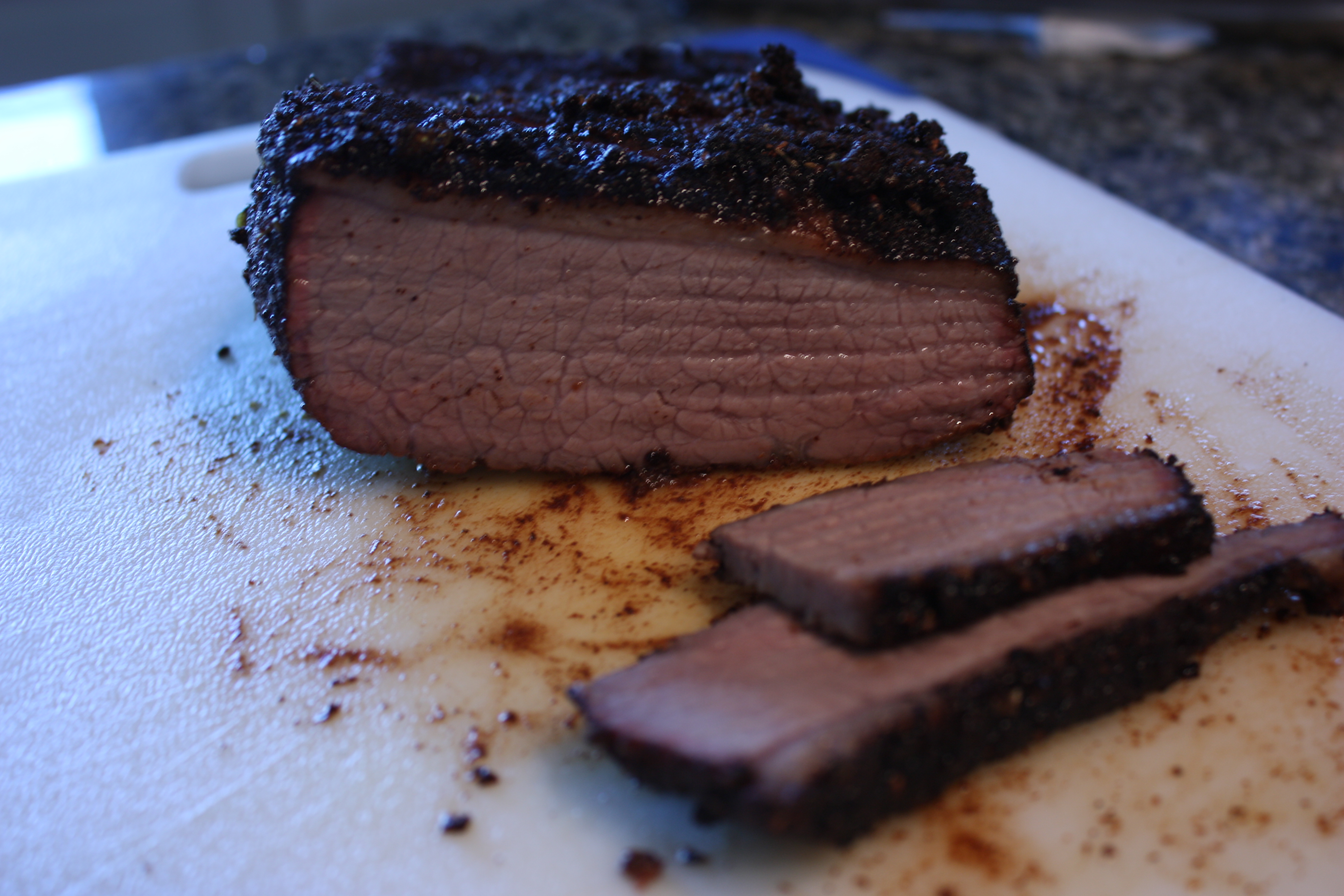 The result was pretty good! The rub was spicy and had a good smoky flavor. The brisket was fairly moist and very flavorful. Next time, I would lower the cooking temperature a bit and cook the meat to about 160 degrees, instead of the recipe recommendation of 190 degrees. All-in-all, I am very happy with my first “smoking” experience.