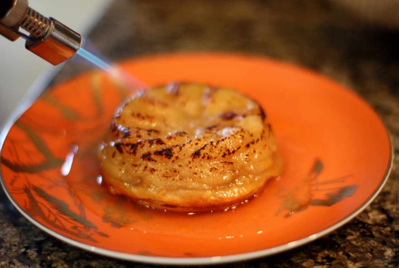 I must admit I was slightly distracted while making this yesterday, trying to do two things at the same time. While the recipe called for brown sugar for a darker color and deeper caramel flavor, I missed the word “brown” and used granulated sugar instead. I combined the sugar and orange zest in my mini food processor and pulsed them together for a few seconds to release the oils in the zest. The resulting orange sugar was so fragrant and it really was a great addition. The recipe directions called for the tarts to bake for about 20 – 25 minutes, but after that amount of time, the bananas were not caramelized at all. The orange sugar/ butter syrup was runny and very pale in color, most likely the result of using granulated instead of brown sugar. I put them back in the oven for another 10 minutes, but they still were not at all brown like a tarte tatin should be. At this point, baking the tarts longer would overcook the puff pastries so I used my kitchen torch to brown the tops and sides of the tarts.