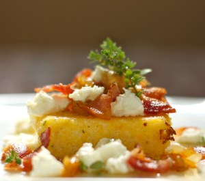 Goat Cheese Polenta with Caramelized Onions, Bacon, and Honey