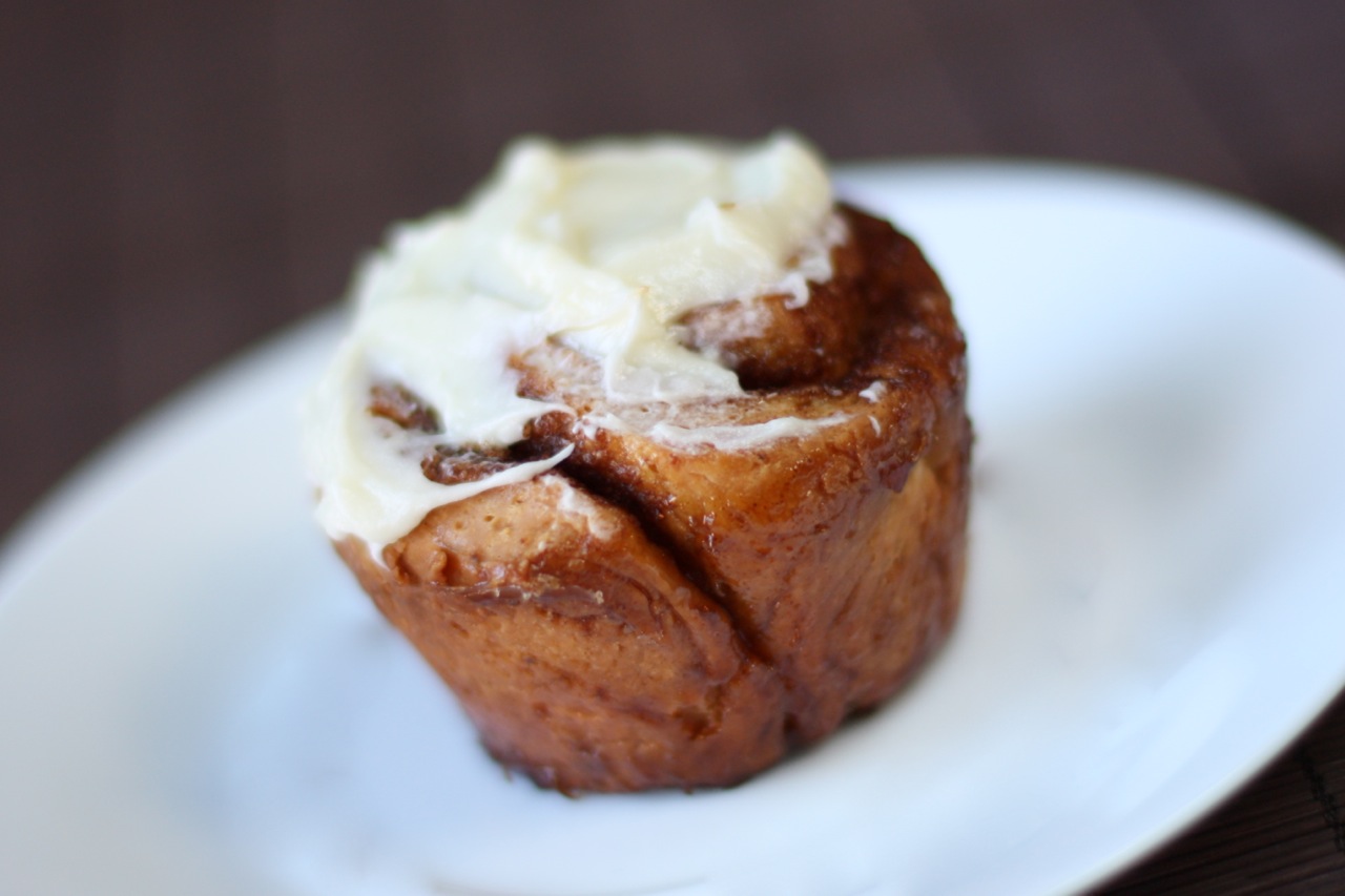 I couldn’t fit all the rolled dough in my smaller pan so I put a few of the rolled dough in a muffin tin and made cinnamon rolls with some cream cheese frosting. For the frosting, I combined 4 ounces of cream cheese (room temperature), 1 cup powdered sugar, and 1/4 cup unsalted butter (room temperature), and 1/2 teaspoon of vanilla extract in a bowl of a stand mixer with the paddle attachment and beat until combined.