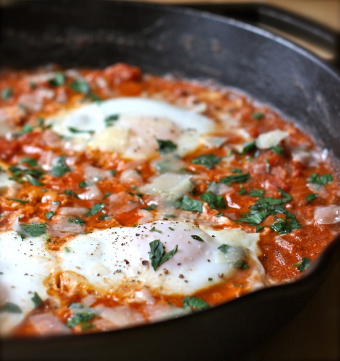 There are many variations of this wonderfully filling and comforting dish. In its simplest form, eggs are poached in a flavorful tomato sauce. In Southern Italy, it is called Uova al Purgatorio, or Eggs in Purgatory (due to the appearance of the eggs cooking in a hot, bubbling sauce resembling flames in hell purgatory), and it is often made with parmesan cheese and basil served over bread, pasta, or polenta. In the Middle East, it is known as Shakshuka, and it is made with a spicier tomato sauce, crumbled feta cheese, peppers, and cumin and served with warm pita bread. The Turkish dish, Menemen, is similar, as the eggs are cooked with tomatoes, onions, and peppers in a single pan, but the eggs are almost always scrambled, instead of poached.