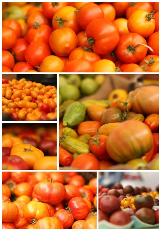 Today at the farmers market, there were tomatoes of all kinds to pick from, piled high on tables under canopies. I went from stall to stall, taking my time to narrow down my choices to a basket of multi-colored cherry tomatoes and a few odd, mishapen heirlooms ranging in color from garnet to orange to lemon yellow. Since the tomatoes were at its best, perfectly ripe and bursting with juice, I wanted to showcase them by simply slicing and dressing them with a fruity vinaigrette.