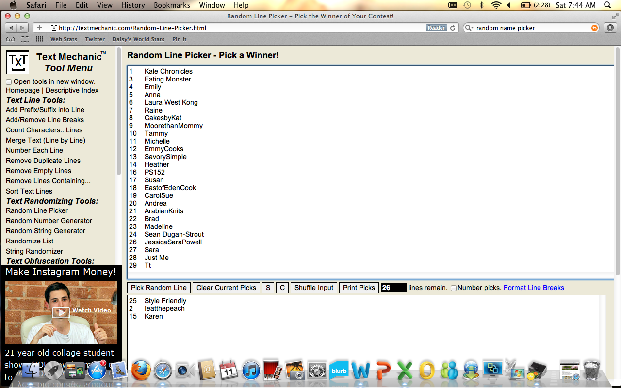 In case you are interested in how I picked the winners, I used this app I found online called Random Line Picker. Here’s a screen shot of the list of entries and the three winners picked at random.