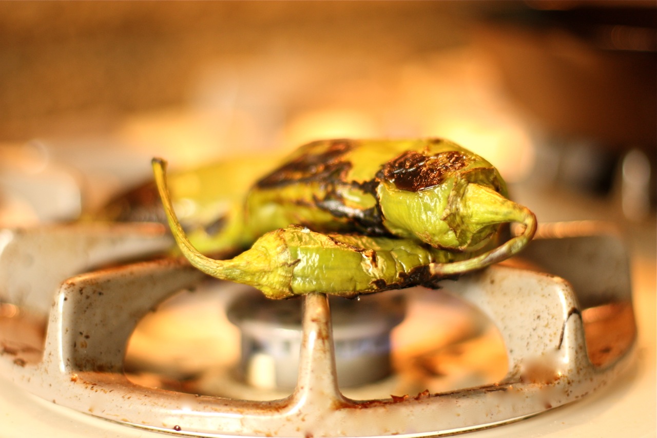 To get the full hatch chile experience, I opted to buy them fresh so I could roast them myself and breathe in and enjoy the aroma that would fill my kitchen. I started roasting them on a cast iron skillet, but that was taking too long, so I took them off the pan and put them directly over the flame of the gas burner. I should have done that in the first place. Applying heat to the chiles not only enhances their flavor, but also makes it easier to peel the tough skin from the pod. Once they were charred and blackened all over, I put the hot chiles in a plastic bag, sealing them in to create steam, which helps to remove the skin. After about 10 minutes, the skins rubbed off easily, while keeping the chiles whole.