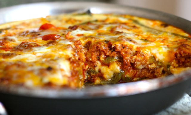 Cut the hatch chiles in half lengthwise and place half of them in a single layer on the bottom of an 8″ x 8″ baking dish (My 7 1/2″ oven-safe fry pan worked great for me). Add half of the chorizo in an even layer on top of the chiles. Sprinkle 1/2 cup of shredded cheese evenly on top of the chorizo. Repeat by adding another layer of chiles, chorizo, and cheese.