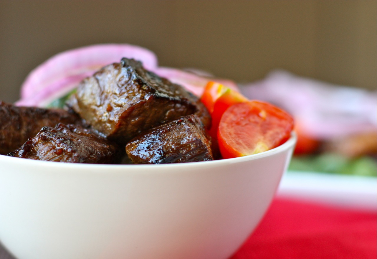 I love how the different elements of this Vietnamese dish, Bo Luc Lac – the beef marinade, vinaigrette, and awesome dipping sauce –  create a complex, yet perfectly balanced combination of sweet, salty, sour, and umami flavors. Since I followed the recipe mostly as written, I won’t be reprinting it here. The only changes I made were to add  bit more soy sauce and fish sauce than the original recipe to suit my taste and to substitute spinach for the watercress.  Perhaps a change I would make the next time I make this dish is in the cut of beef. I think the ribeye, a more flavorful and tender cut of beef than the sirloin steak called for in the original recipe would be a better choice.