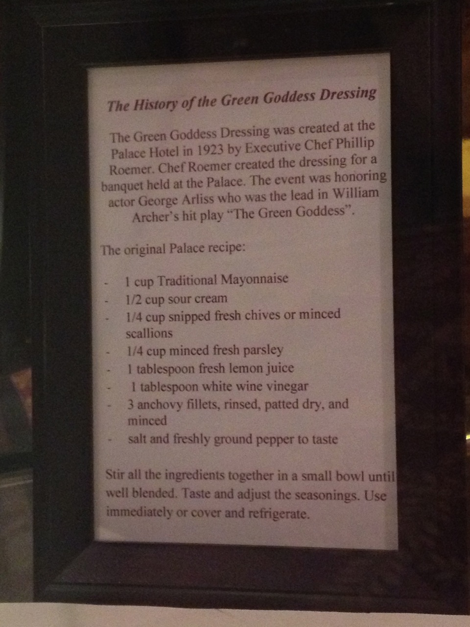 While in San Francisco, we stayed at the historic “new” Palace Hotel, which opened in December 1909, at the site of the original Palace Hotel that was destroyed by the fires that ravaged the city after the infamous 1906 earthquake. I was looking through the historical displays that adorn the hotel corridors and learned that Green Goddess Dressing was invented there in the 1920s. The hotel’s executive chef, Philip Roemer, created it for a banquet held in honor of actor George Arliss, who at the time was starring in William Archer’s hit play, The Green Goddess.