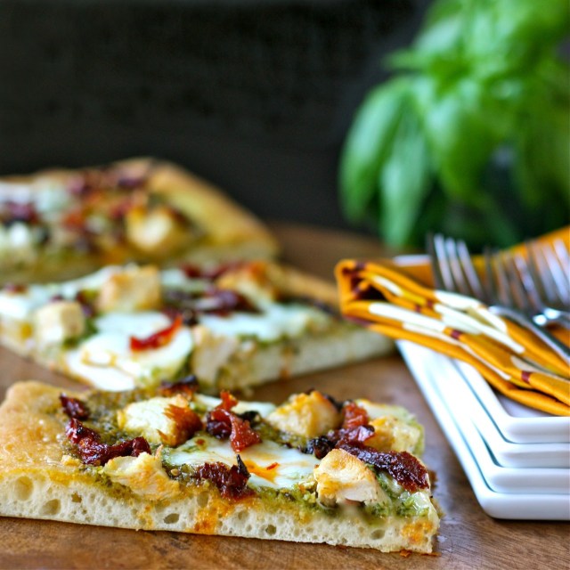 pesto pizza with chicken, mozzarella, and sun-dried tomatoes