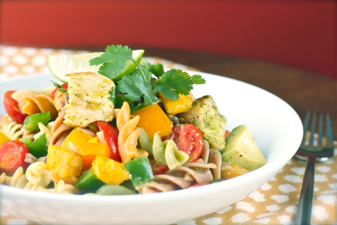 As a regular reader, you’ve probably noticed that I am particularly fond of sugar and butter, which, unfortunately, is not good for me nor my waistline. That’s why I am excited to find recipes as healthy and tasty as this pasta salad. With luscious mangoes, creamy avocados, sweet tomatoes and bell peppers, I’ve found a great way to incorporate more fruits and vegetables into my diet.