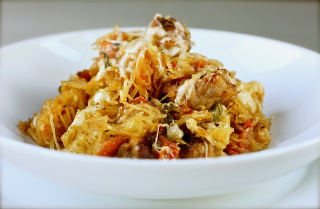 spaghetti squash with sausage, tomatoes, and sage