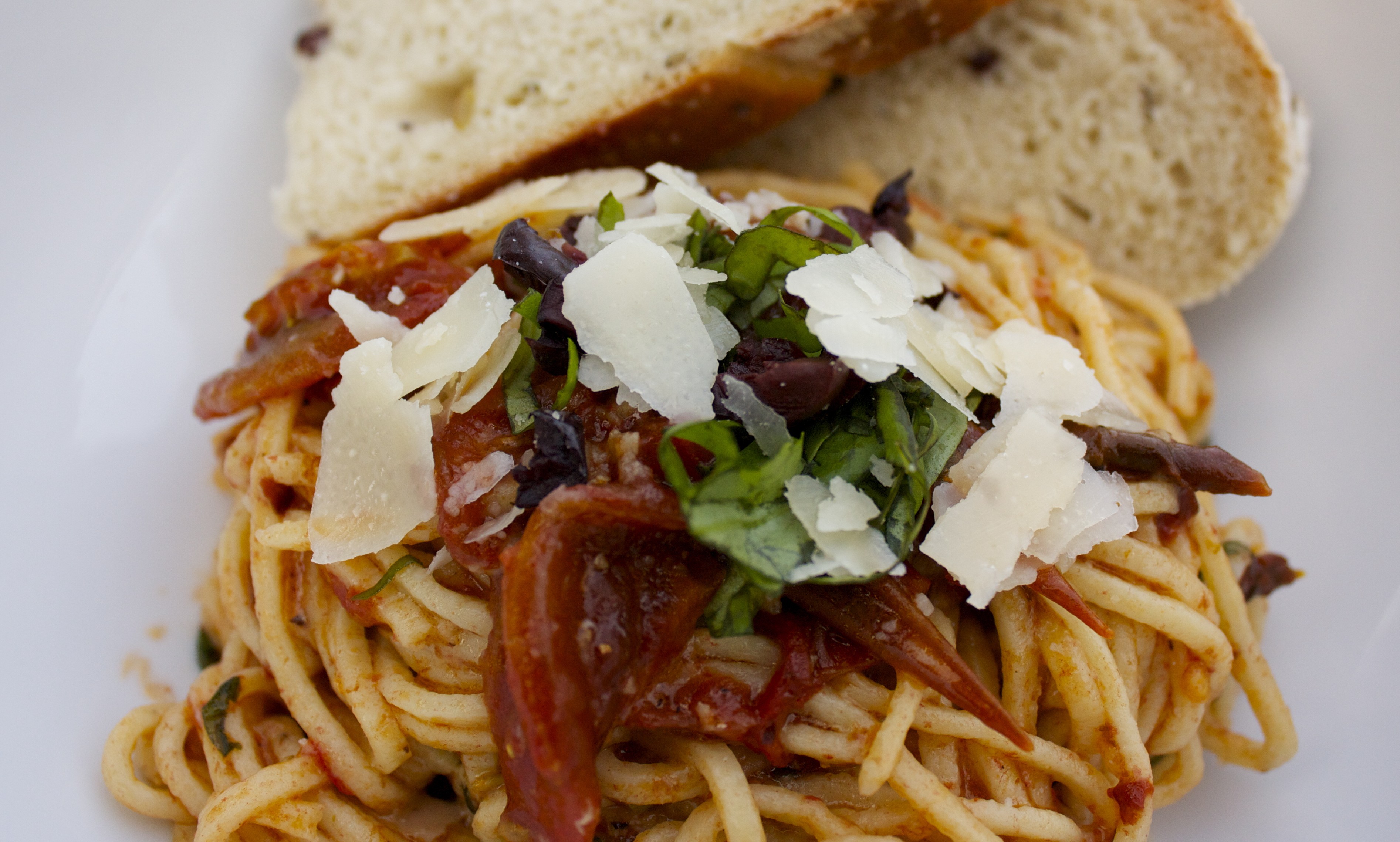 Chris and I have been cooking from scratch lately and we came up with a decidedly un-Fourth of July dinner, using the newly discovered Kumatos – roasted tomato and basil pasta and rosemary-olive bread. Chris made the fresh angel hair pasta and we collaborated on the sauce. I roasted the Kumatos in the oven in olive oil with a little balsamic vinegar and garlic for about 15 minutes. I transferred it to a sauce pan with more olive oil and garlic and added red pepper flakes, parmesan cheese, basil, and salt and pepper.