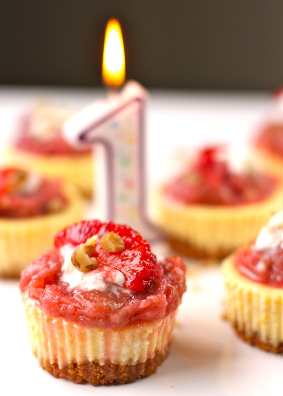 commemorating year one: mini cheesecakes with blood orange and rhubarb compote
